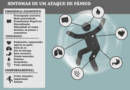 Taquicardia, sudorese, falta de ar, tremor, calafrios, tontura, sensação de perigo eminente. Esses são alguns dos sintomas que os portadores da Síndrome do Pânico sentem quando entram em crise. Também conhecida como transtorno da ansiedade, essas crises podem durar de 15 a 30 minutos e variam de acordo com cada pessoa e a intensidade do ataque. Após essas crises, a pessoa fica sonolenta e exausta pois gastou muita energia física e mental.